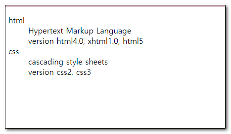 1<!DOCTYPE html>2<html lang="ko">3<head>4 <meta charset="UTF-8">5 <title>설명 목록</title>6</head>7<body>8 <dl>9 <dt>html</dt>10 <dd>Hypertext Markup Language</dd>11 <dd>version html4.0, xhtml1.0, html5</dd>12 <dt>css</dt>13 <dd>cascading style sheets</dd>14 <dd>version css2, css3</dd>15 </dl>16</body>17</html>형성평가