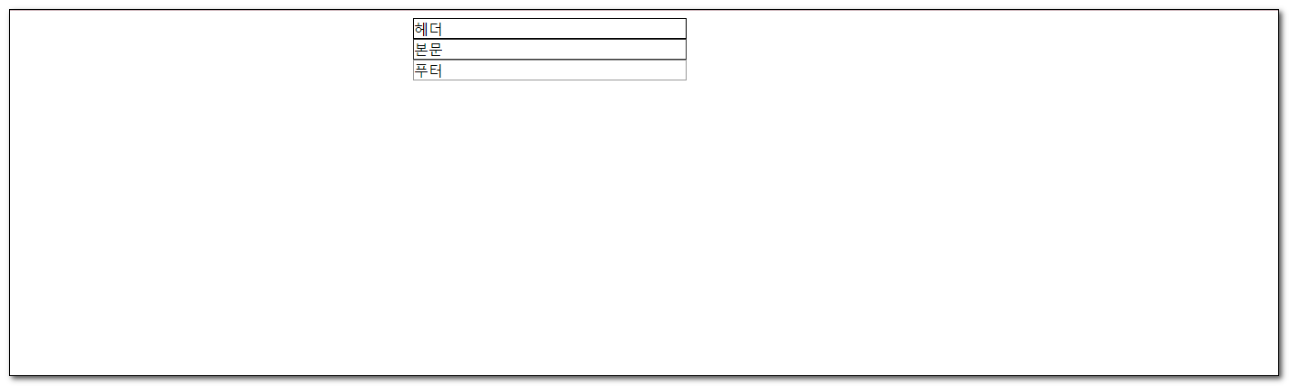 1<!DOCTYPE html>2<html lang="ko">3<head>4 <meta charset="UTF-8">5 <title>그룹 요소</title>6 <style>7 header{8 width: 300px;9 margin: 0 auto;10 border: 1px solid #000;11 }12 section{13 width: 300px;14 margin: 0 auto;15 border: 1px solid #333;16 }17 footer{18 width: 300px;19 margin: 0 auto;20 border: 1px solid #999;21 }22 </style>23</head>24<body>25 <header>헤더</header>26 <section>본문</section>27 <footer>푸터</footer>28</body>29</html>↓ div로 그룹화