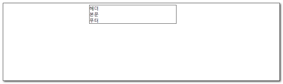 1<!DOCTYPE html>2<html lang="ko">3<head>4 <meta charset="UTF-8">5 <title>그룹 요소</title>6 <style>7 #wrap{8 width: 300px;9 margin: 0 auto;10 border: 1px solid #000;11 }12 </style>13</head>14<body>15 **<div id="wrap">**16 <header>헤더</header>17 <section>본문</section>18 <footer>푸터</footer>19 **</div> **20</body>21</html>02. span