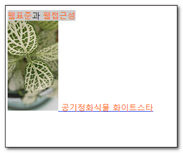 1<!DOCTYPE html>2<html lang="ko">3<head>4 <meta charset="UTF-8">5 <title>그룹 요소</title>6 <style>7 .s1{8 background-color: #ccc;9 }10 .s2{11 color: #ff6600;12 }13 </style>14</head>15<body>16 <span class="s1"><span class="s2">웹표준</span>과 <span class="s2">웹접근성</span></span>17 <div>18 <a href="#">19 <span><img src="images/whitestar.jpg" alt></span>20 <span class="s2">공기정화식물 화이트스타</span>21 </a>22 </div>23</body>24</html>03.시맨틱 구조요소