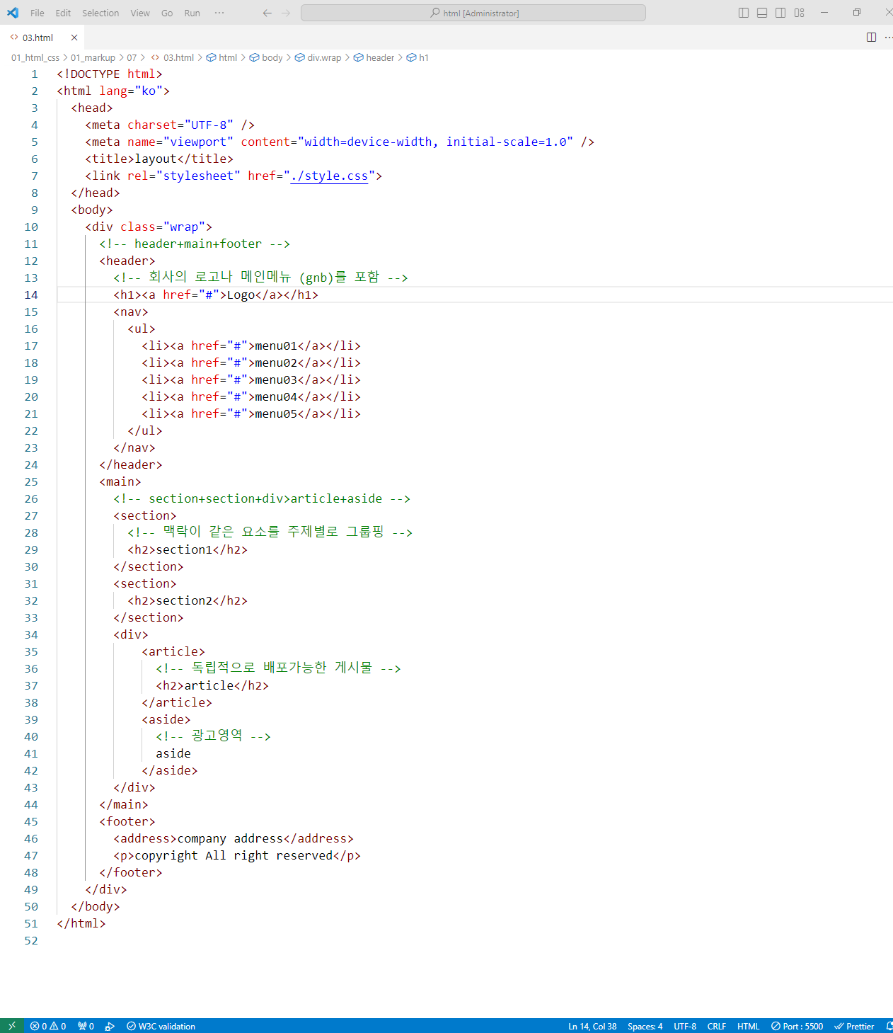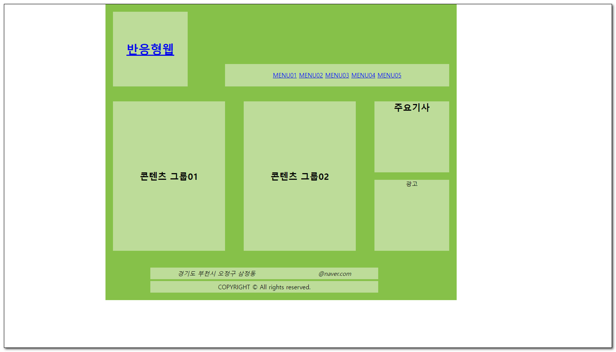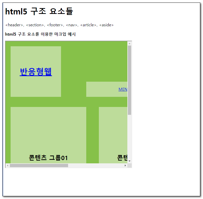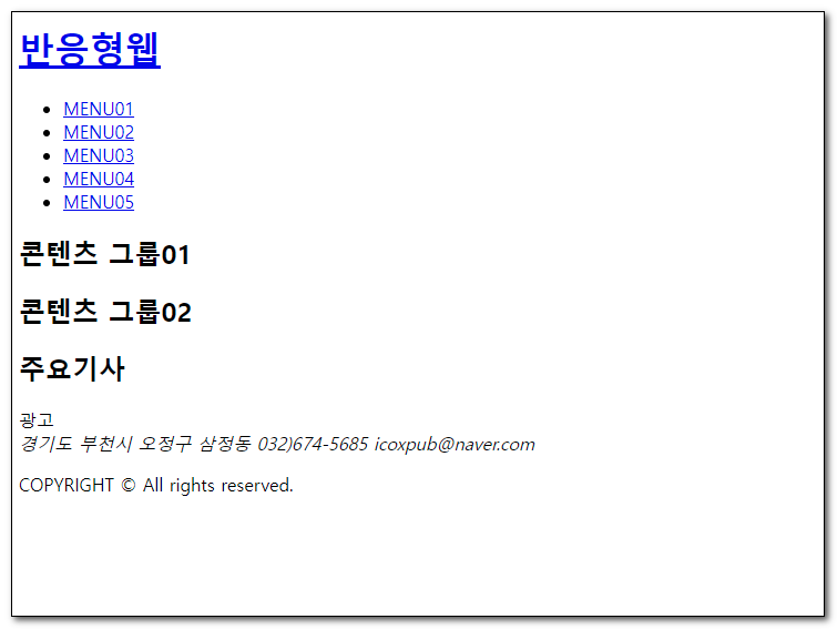 1<!DOCTYPE html>2<html lang="ko">3 <head>4 <meta charset="UTF-8" />5 <title>구조 요소</title>6 </head>7 <body>8 <header>9 <h1><a href="#">반응형웹</a></h1>10 <nav>11 <ul>12 <li><a href="#">MENU01</a></li>13 <li><a href="#">MENU02</a></li>14 <li><a href="#">MENU03</a></li>15 <li><a href="#">MENU04</a></li>16 <li><a href="#">MENU05</a></li>17 </ul>18 </nav>19 </header>20 <div id="container">21 <section>22 <h2>콘텐츠 그룹01</h2>23 </section>24 <section>25 <h2>콘텐츠 그룹02</h2>26 </section>27 <article>28 <h2>주요기사</h2>29 </article>30 <aside>광고</aside>31 </div>32 <footer>33 <address>경기도 부천시 오정구 삼정동 000)674-5685 email@naver.com</address>34 <p>COPYRIGHT © All rights reserved.</p>35 </footer>36 </body>37</html>