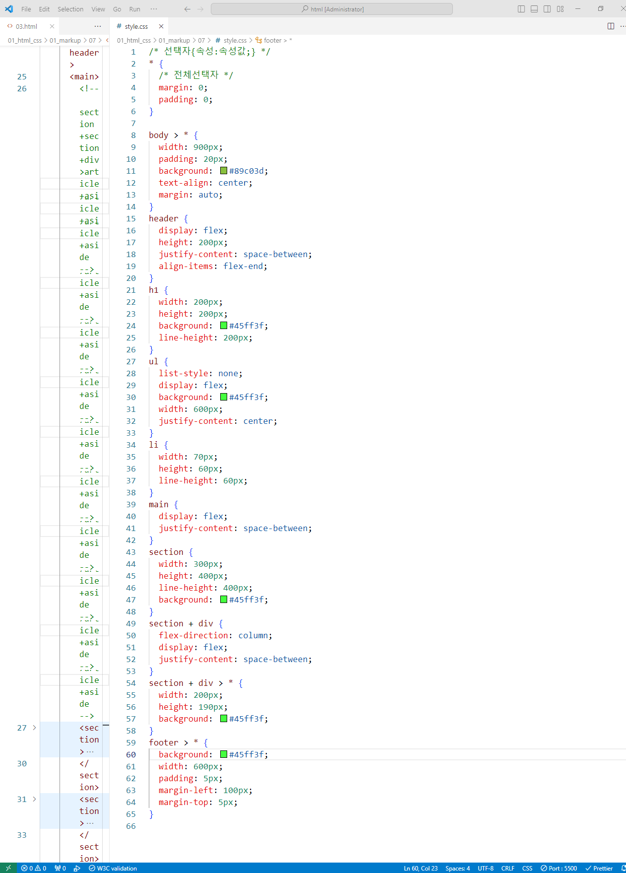 1<!DOCTYPE html>2<html lang="ko">3 <head>4 <meta charset="UTF-8" />5 <title>구조 요소</title>6 <link rel="stylesheet" href="style.css">7 </head>8 <body>9 <header>10 <h1><a href="#">반응형웹</a></h1>11 <nav>12 <ul>13 <li><a href="#">MENU01</a></li>14 <li><a href="#">MENU02</a></li>15 <li><a href="#">MENU03</a></li>16 <li><a href="#">MENU04</a></li>17 <li><a href="#">MENU05</a></li>18 </ul>19 </nav>20 </header>21 <div id="container">22 <section>23 <h2>콘텐츠 그룹01</h2>24 </section>25 <section>26 <h2>콘텐츠 그룹02</h2>27 </section>28** <div>29 <article>30 <h2>주요기사</h2>31 </article>32 <aside>광고</aside>33 </div>**34 </div>35 <footer>36 <address>경기도 부천시 오정구 삼정동 000)674-5685 email@naver.com</address>37 <p>COPYRIGHT © All rights reserved.</p>38 </footer>39 </body>40</html>1**/* style.css */2**3* {4 margin: 0;5 padding: 0;6}7body > * {8 width: 900px;9 padding: 20px;10 background: #89c03d;11 text-align: center;12 margin:auto;13}14header {15 display: flex;16 height: 200px;17 justify-content: space-between;18 align-items: flex-end;19}20h1 {21 width: 200px;22 height: 200px;23 background: #bedb96;24 line-height: 200px;25}26ul {27 display: flex;28 list-style: none;29 background: #bedb96;30 width: 600px;31 justify-content: center;32}33li {34 width: 70px;35 height: 60px;36 line-height: 60px;37}38#container {39 display: flex;40 justify-content: space-between;41}42section {43 background: #bedb96;44 width: 300px;45 height: 400px;46 line-height: 400px;47}48section + div {49 display: flex;50 flex-direction: column;51 justify-content: space-between;52}53section + div * {54 width: 200px;55 height: 190px;56 background: #bedb96;57}58
