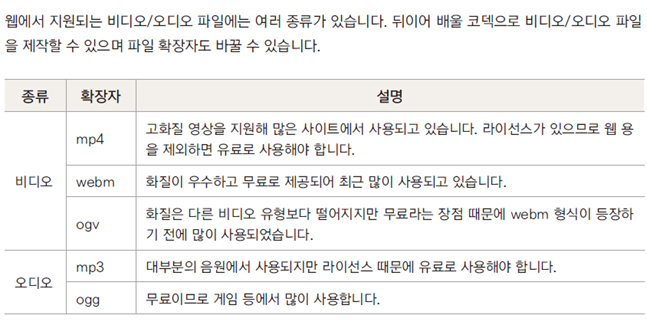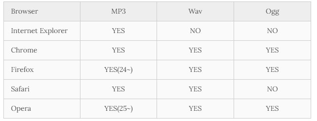 브라우저별 지원하는 코덱이 상이하니 호환성을 체크하고 추가한다 ** 코덱별 호환성 체크 :** ** **https://caniuse.com/?search=mp3 https://developer.mozilla.org/ko/docs/Web/Media/Formats/Containers