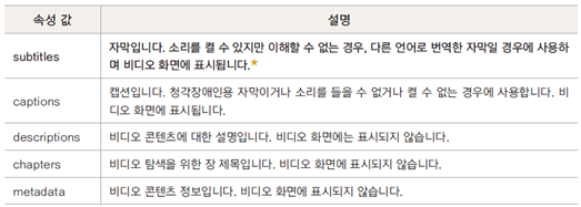 1<track kind="자막의 종류" src="파일 경로" srclang="사용한 언어" lable="제목" default>파일은 media 폴더에 저장 subtitle_ko.vtt