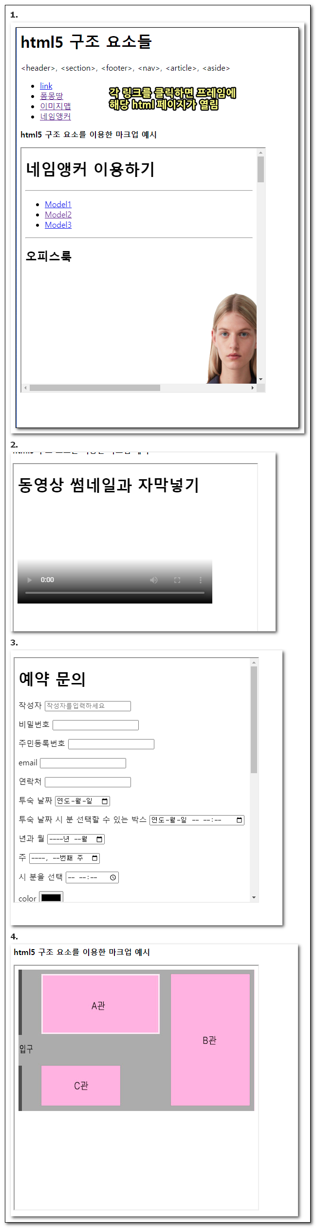 1<!DOCTYPE html>2<html lang="ko">3 <head>4 <meta charset="UTF-8" />5 <title>iframe</title>6 </head>7 <body>8 <h1>html5 구조 요소들</h1>9 <p><header>, <section>, <footer>, <nav>, <article>, <aside></p>10 <nav>11 <ul>12 <li><a href="ex1-39-1.html" target="mainframe">link</a></li>13 <li><a href="ex1-29.html" target="mainframe">폼몽땅</a></li>14 <li><a href="ex1-12.html" target="mainframe">이미지맵</a></li>15 <li><a href="ex1-18-2.html" target="mainframe">네임앵커</a></li>16 </ul>17 </nav>18 <p><strong>html5 구조 요소를 이용한 마크업 예시</strong></p>19 <div>20 <iframe src="ex1-37.html" title="반응형웹" width="500" height="500" name="mainframe"></iframe>21 </div>22 </body>23</html>